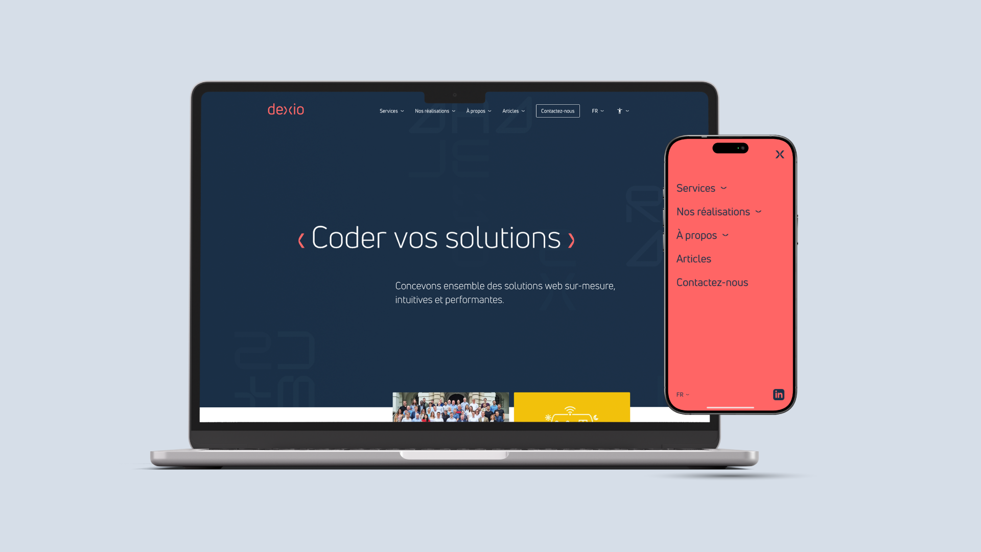 Ce projet est le fruit d’une belle co-création avec notre client (cœur cœur). Greg s’est chargé de l’accompagnement stratégique, du naming et de la conception-rédaction. Damien, chef cuisinier graphique, a concocté les nombreux ingrédients visuels qui composent la nouvelle recette. Aline a pris le relais pour adapter le tout et s’assurer que le menu soit aussi savoureux que lisible. Et côté client, Dexio a mobilisé ses geeks·es de compet’ pour développer l’ensemble avec brio.