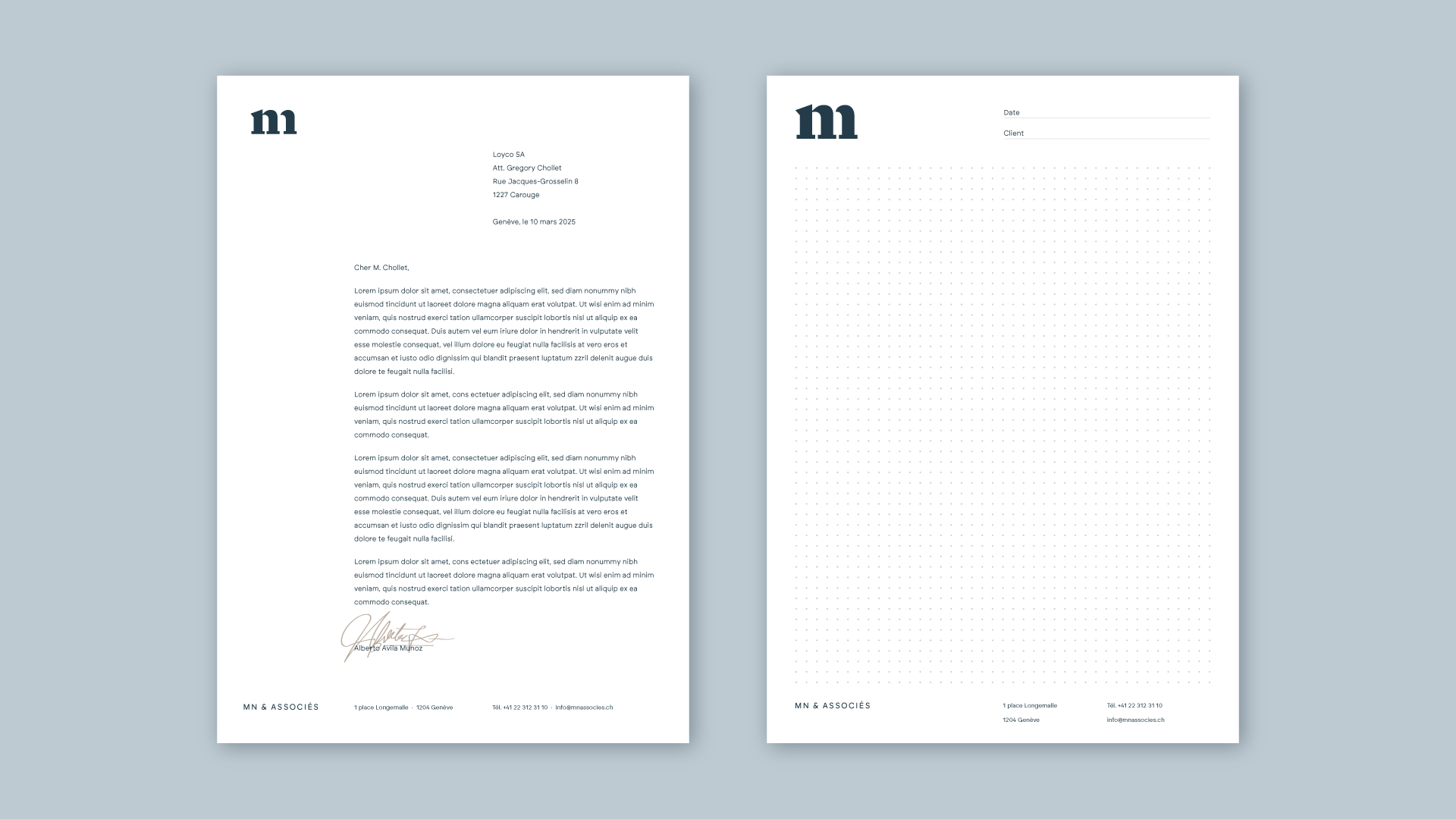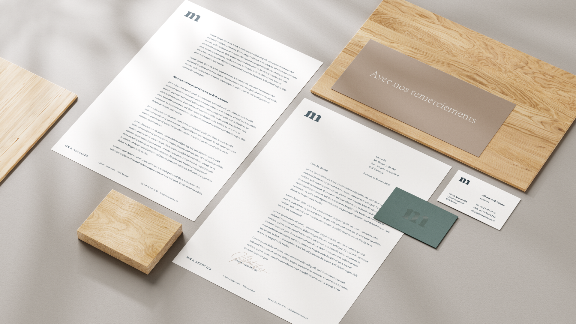 Dans la continuité du site et de la direction artistique, l’identité se décline aussi sur la papeterie : cartes de visite, en-têtes, documents officiels.