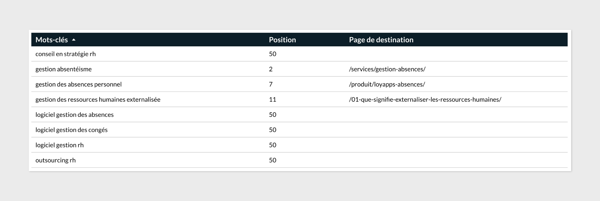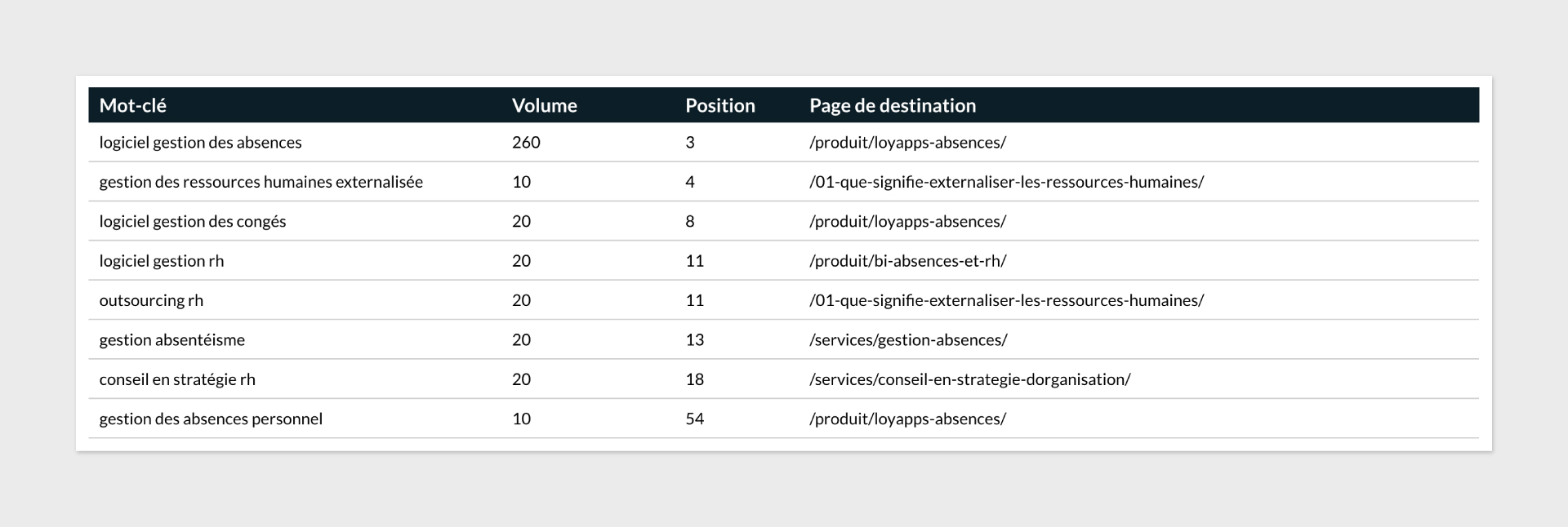Sur les mots-clés liés aux RH, comme « logiciel gestion absence », les pages aux sujets des produits Loyco se hissent dans les 3 premières positions. La page Externalisation RH, elle aussi, tire son épingle du jeu. La page Admin RH se positionne aussi dans le top 10 sur « outsourcing ressources humaines ».