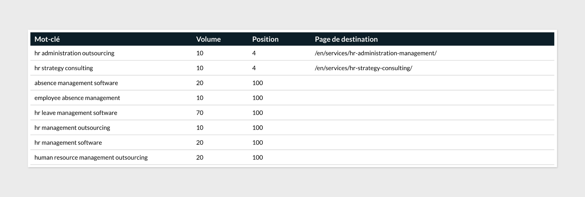 Sur Google en anglais, le site ressort bien sur « HR strategy consulting ». Mais les expressions comme « absence management software » ou « leave management tool » restent à travailler.